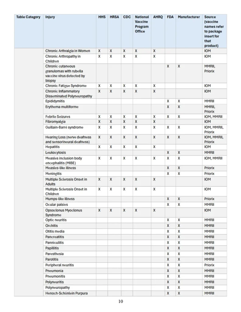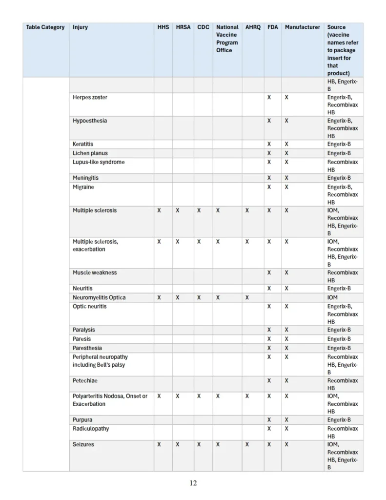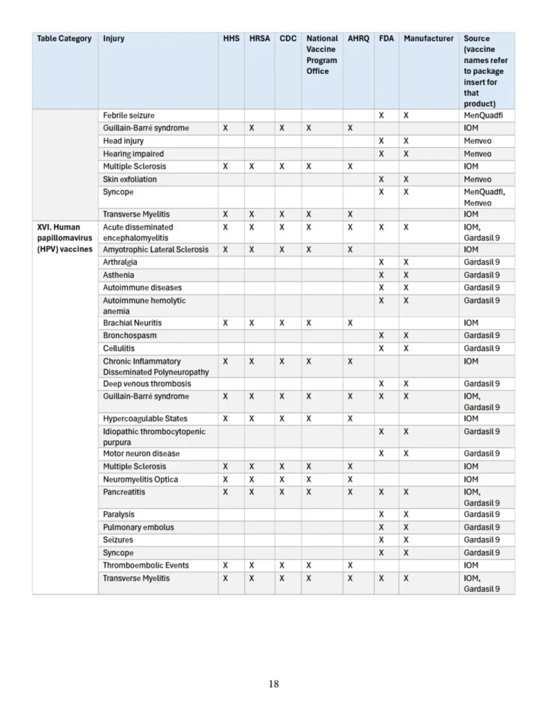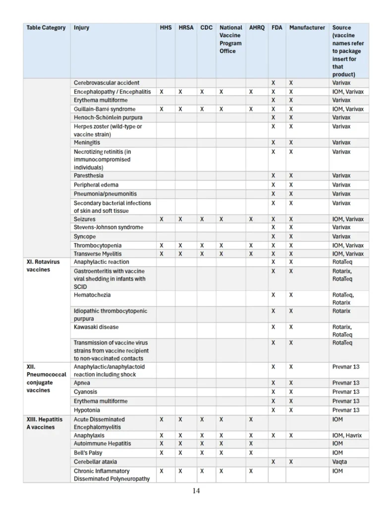 Se adjunta como “Apéndice” un cuadro que identifica parejas específicas de vacuna y lesión que las autoridades sanitarias federales han reconocido previamente en diversas publicaciones oficiales como asociadas con vacunas cubiertas conforme al significado de 42 U.S.C. § 300aa-14(e). Este cuadro recopila hallazgos y reconocimientos contenidos en el informe del IOM de 2012, encargado y/o financiado por HHS, HRSA, CDC y la Oficina Nacional del Programa de Vacunas; en el informe AHRQ de 2021; en materiales del CDC; y en los prospectos aprobados por la FDA de los fabricantes de vacunas.