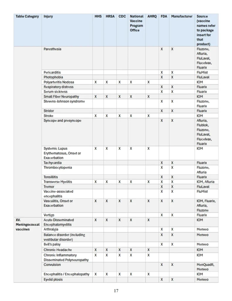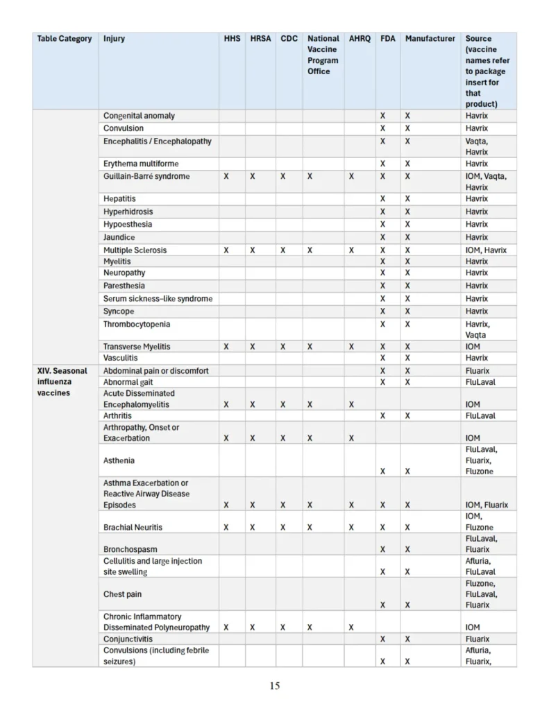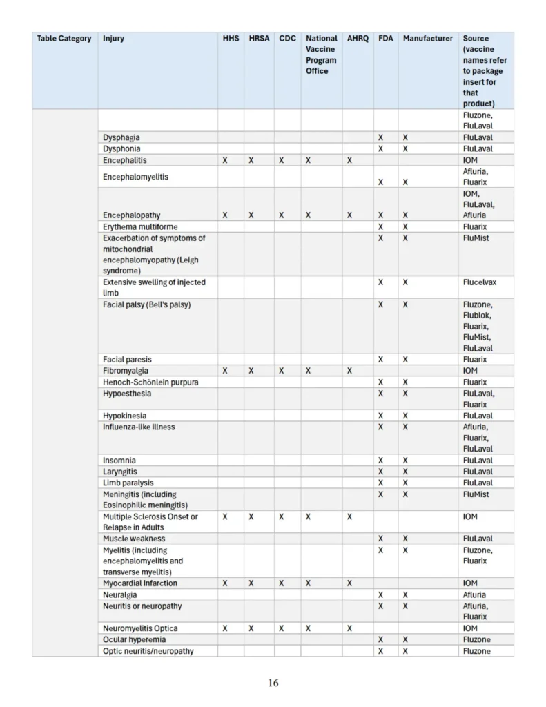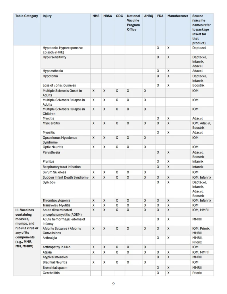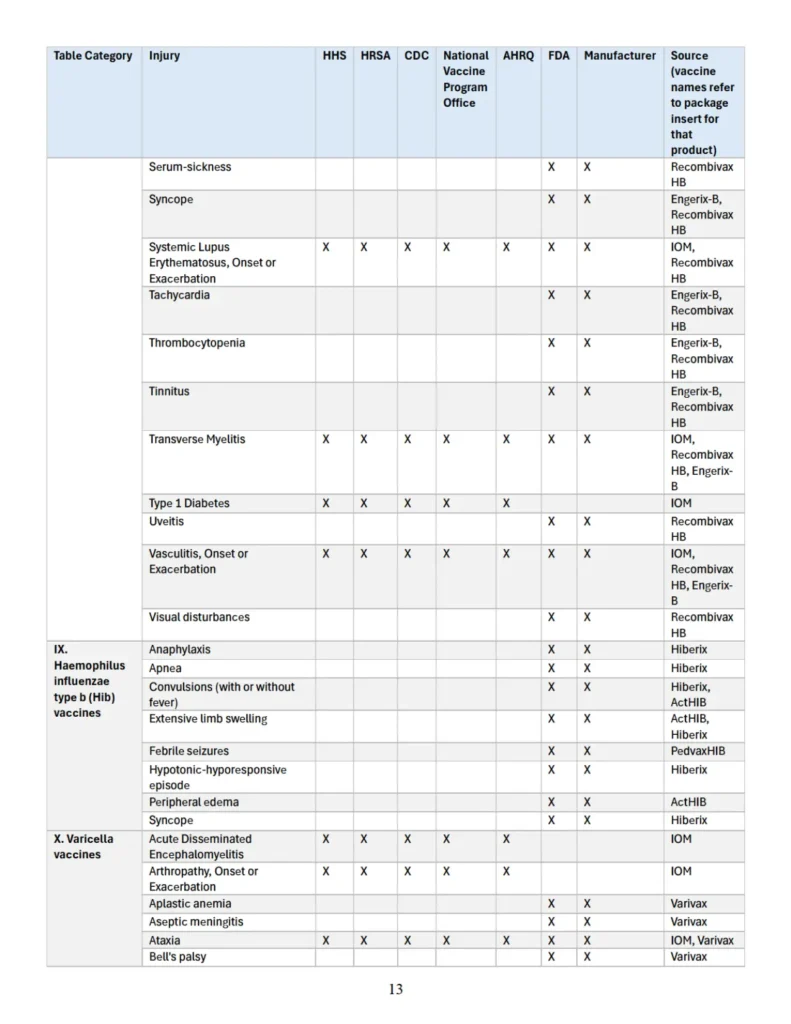 Se adjunta como “Apéndice” un cuadro que identifica parejas específicas de vacuna y lesión que las autoridades sanitarias federales han reconocido previamente en diversas publicaciones oficiales como asociadas con vacunas cubiertas conforme al significado de 42 U.S.C. § 300aa-14(e). Este cuadro recopila hallazgos y reconocimientos contenidos en el informe del IOM de 2012, encargado y/o financiado por HHS, HRSA, CDC y la Oficina Nacional del Programa de Vacunas; en el informe AHRQ de 2021; en materiales del CDC; y en los prospectos aprobados por la FDA de los fabricantes de vacunas.