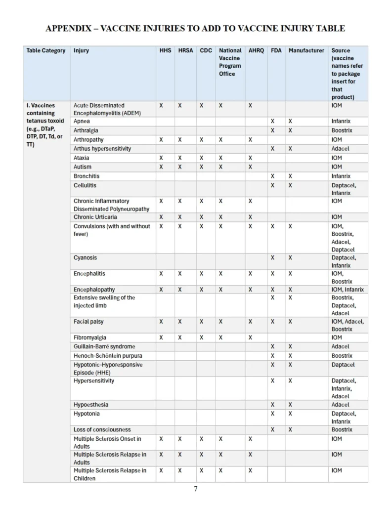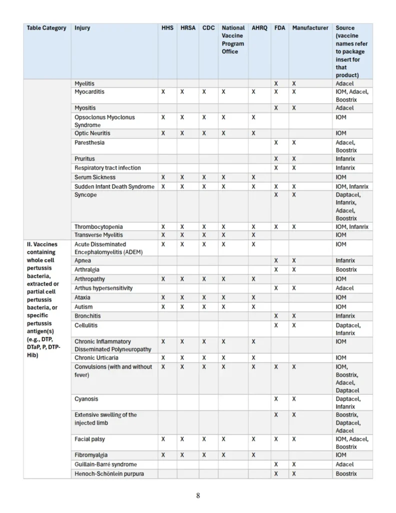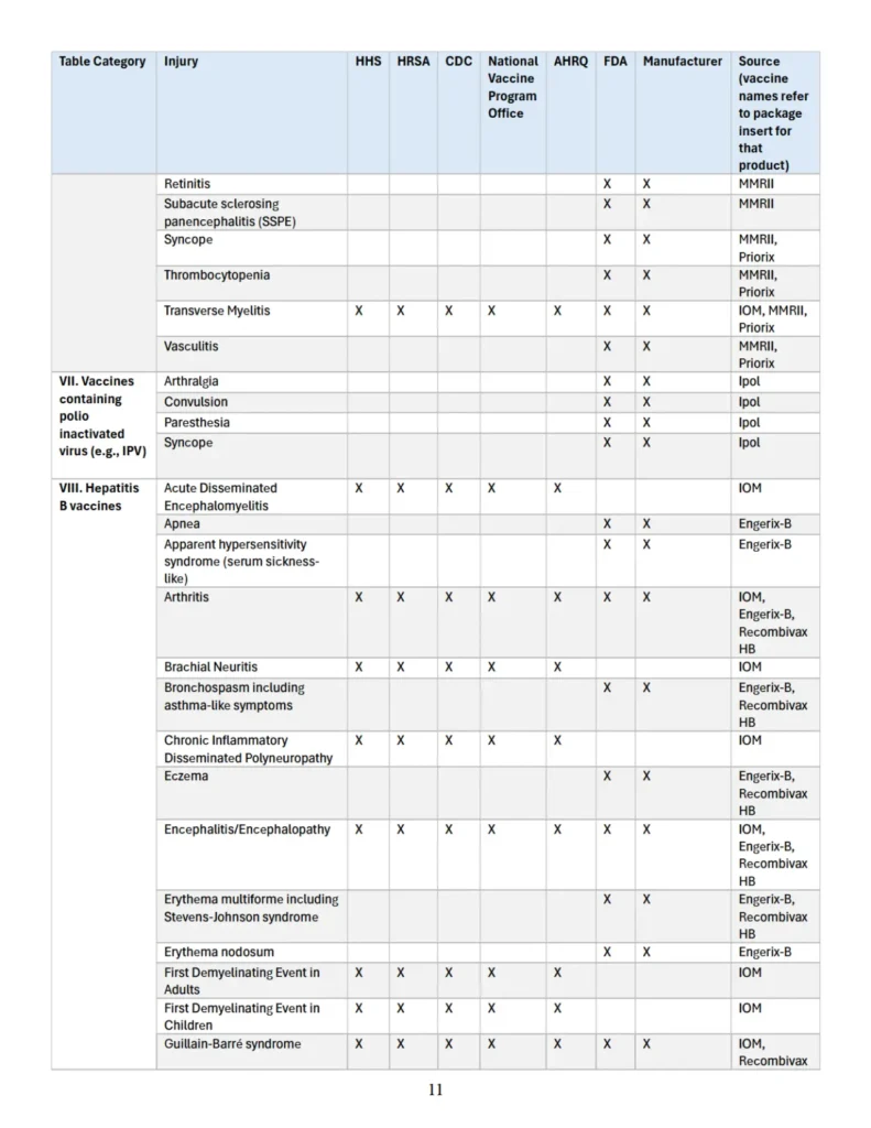 Además, el Apéndice especifica, cuando corresponde, cada entidad federal y/o fabricante que ha reconocido dicha asociación, así como el documento fuente en el que consta tal reconocimiento. Esta recopilación busca facilitar al Secretario el cumplimiento de sus responsabilidades legales mediante una referencia consolidada de lesiones reconocidas en la literatura sanitaria federal como “asociadas con” determinadas vacunas.