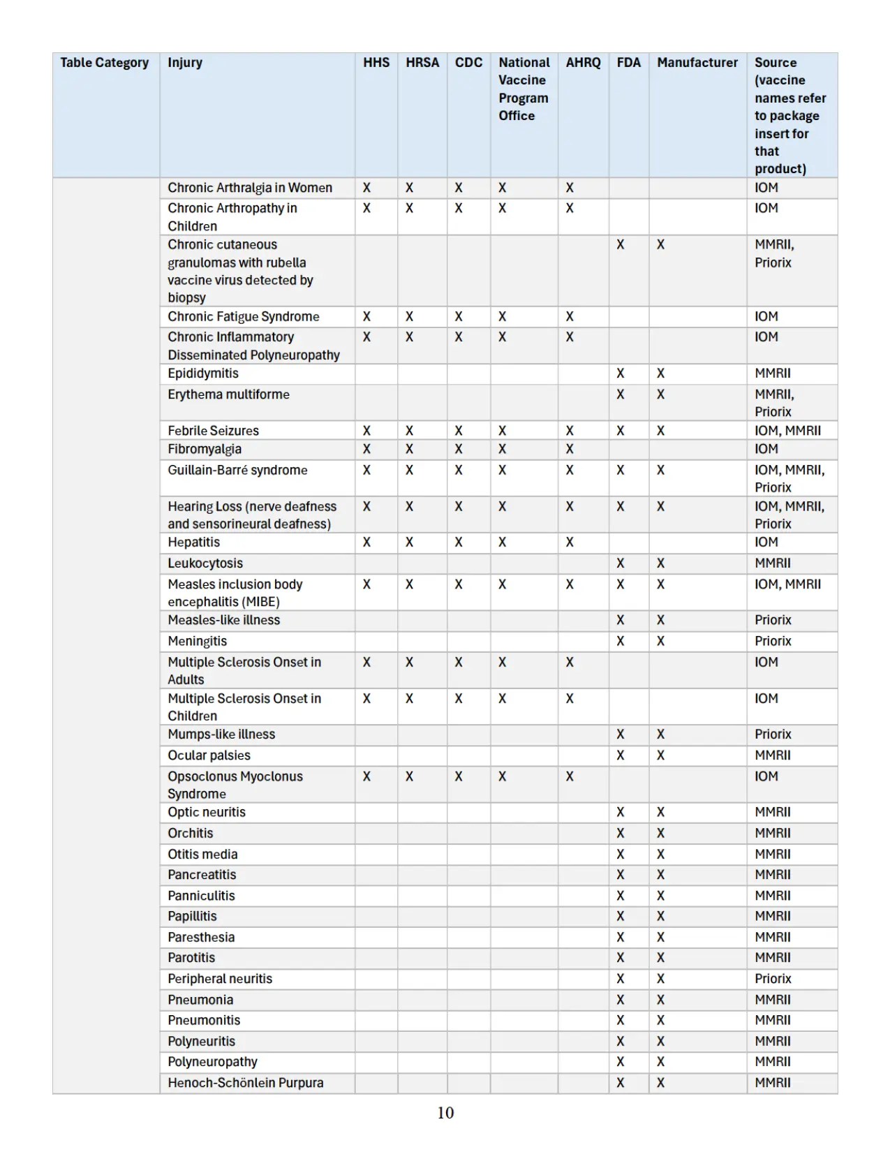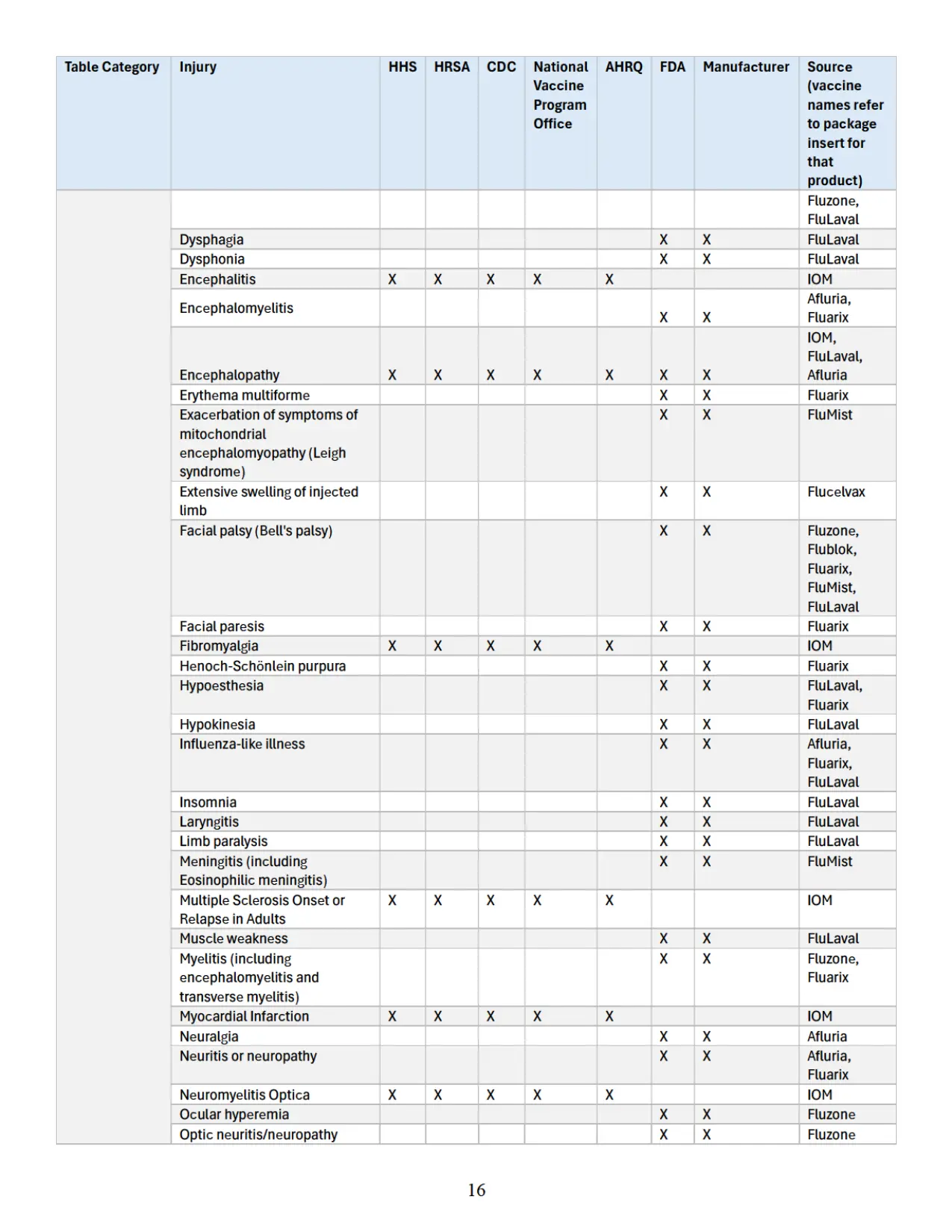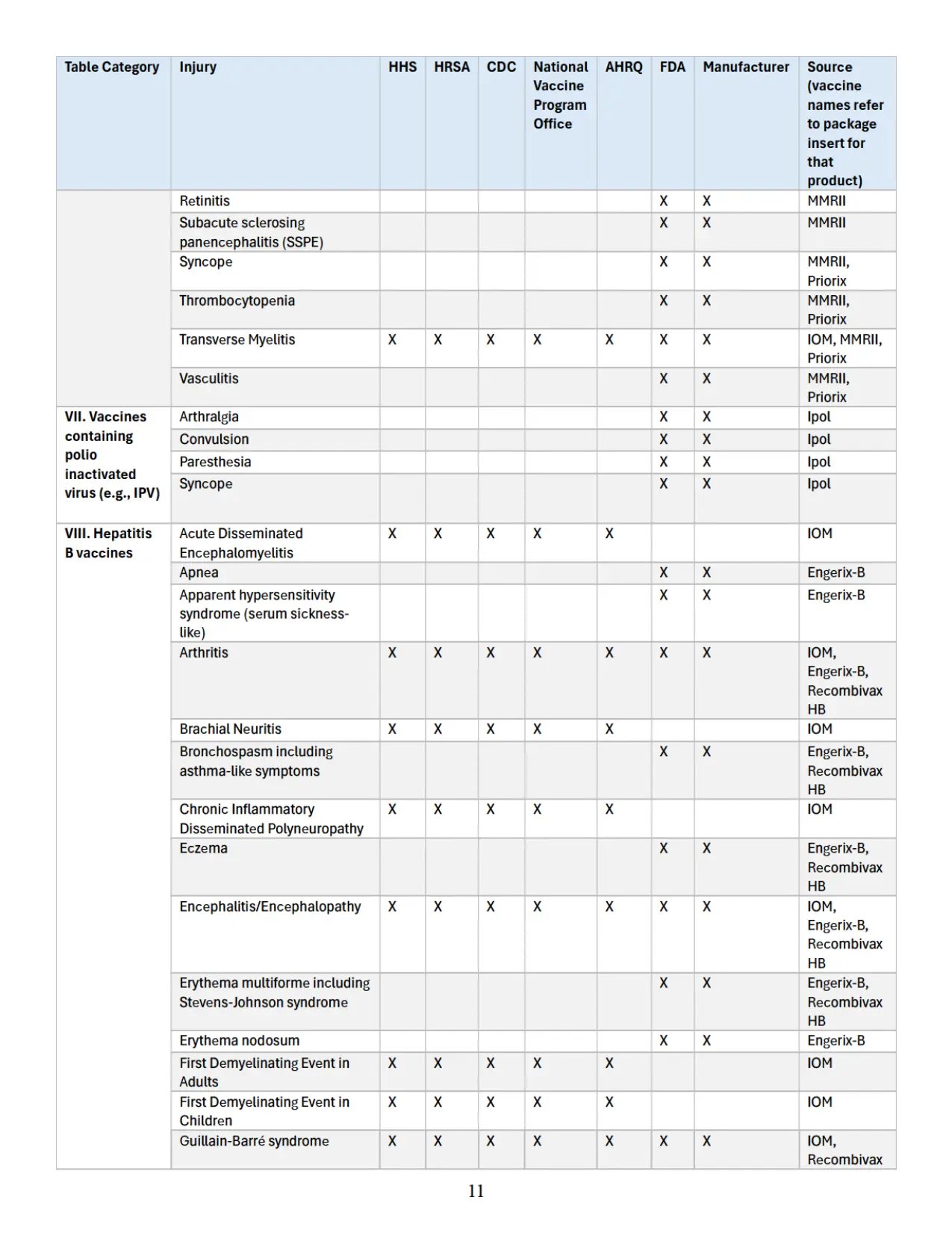 Se adjunta como “Apéndice” un cuadro que identifica parejas específicas de vacuna y lesión que las autoridades sanitarias federales han reconocido previamente en diversas publicaciones oficiales como asociadas con vacunas cubiertas conforme al significado de 42 U.S.C. § 300aa-14(e). Este cuadro recopila hallazgos y reconocimientos contenidos en el informe del IOM de 2012, encargado y/o financiado por HHS, HRSA, CDC y la Oficina Nacional del Programa de Vacunas; en el informe AHRQ de 2021; en materiales del CDC; y en los prospectos aprobados por la FDA de los fabricantes de vacunas.
