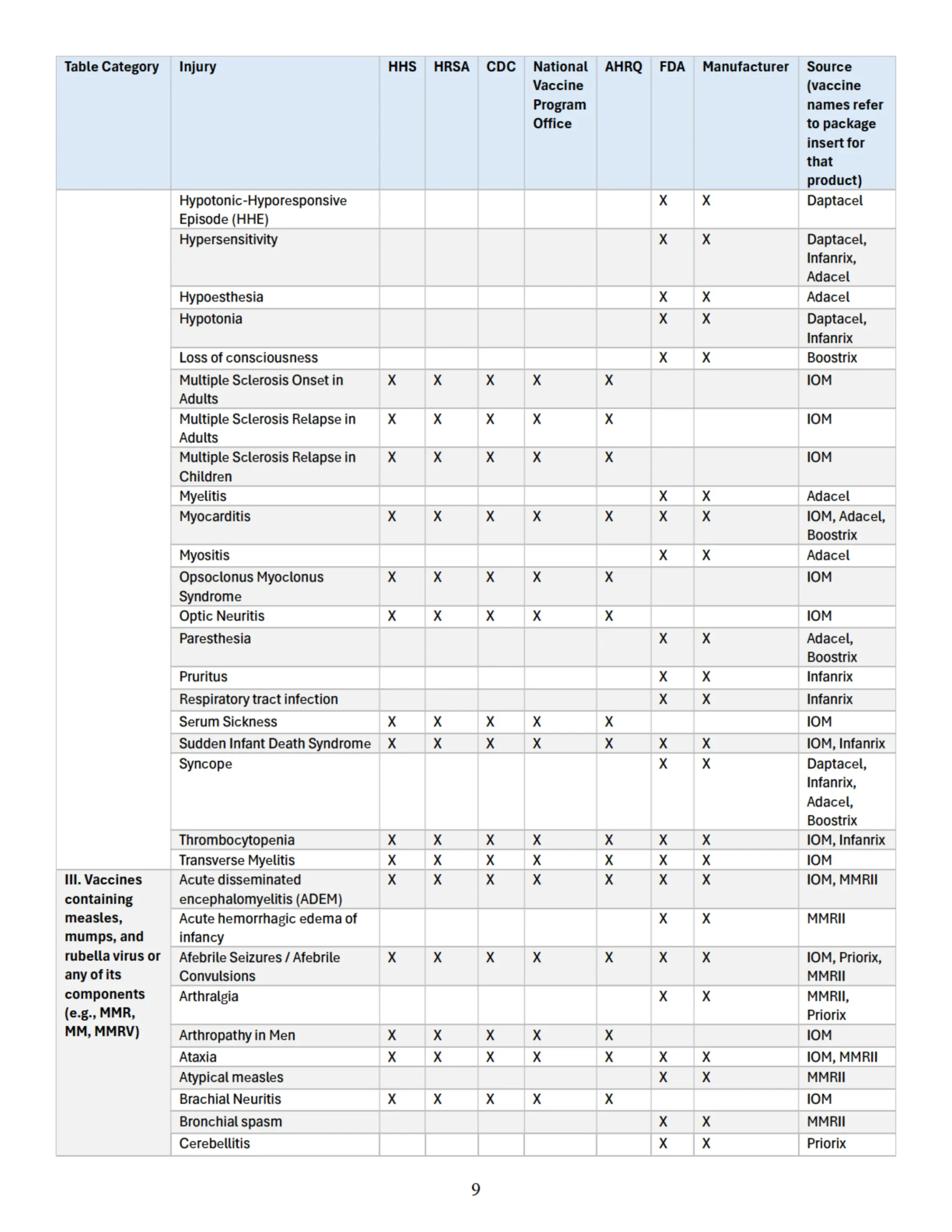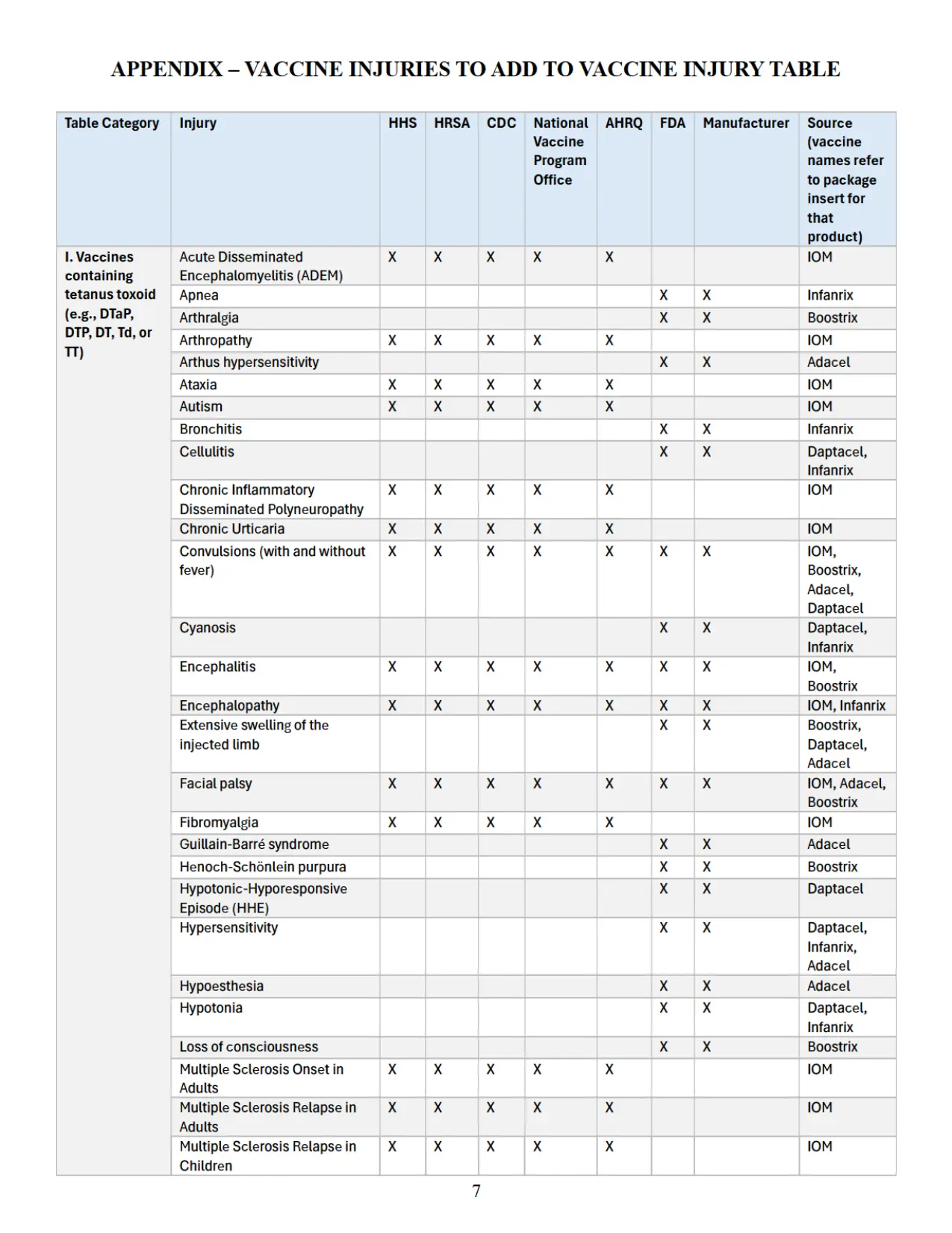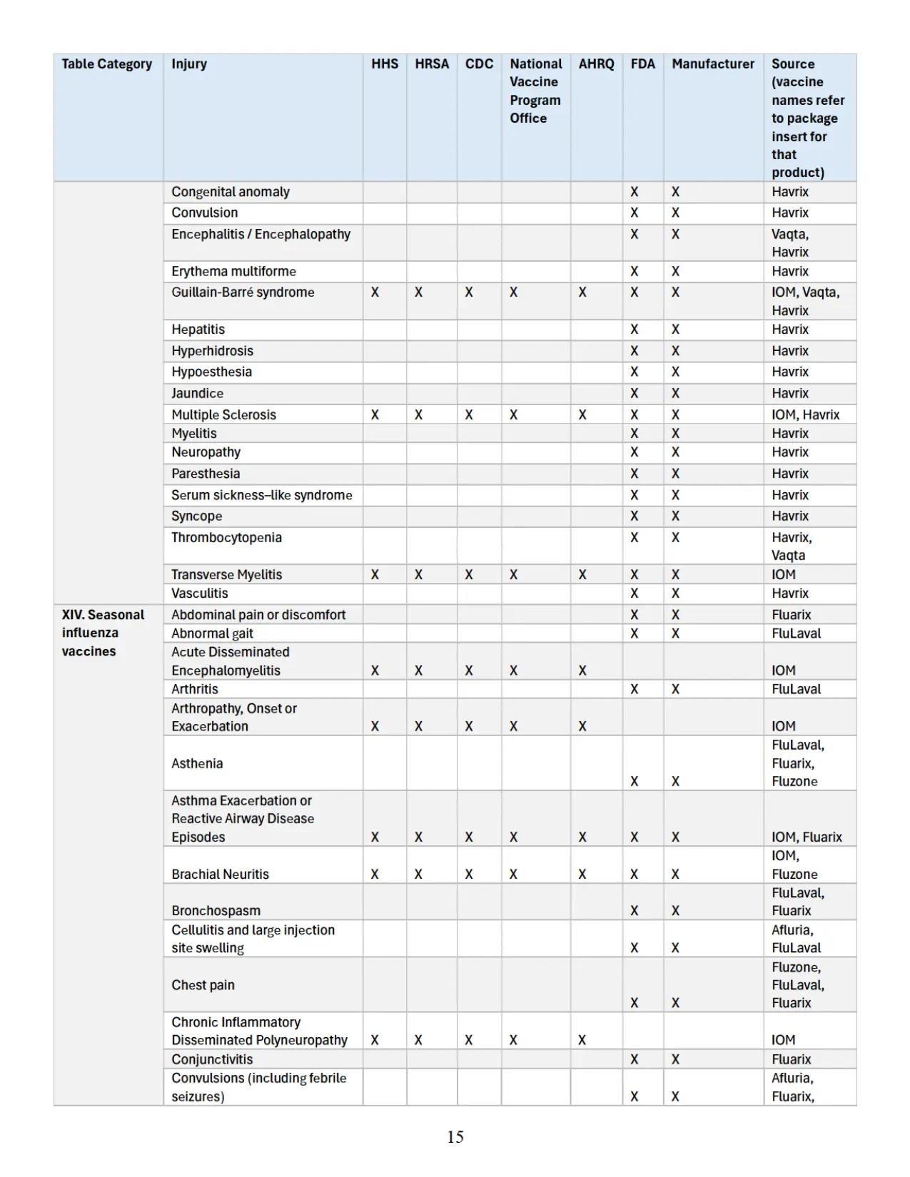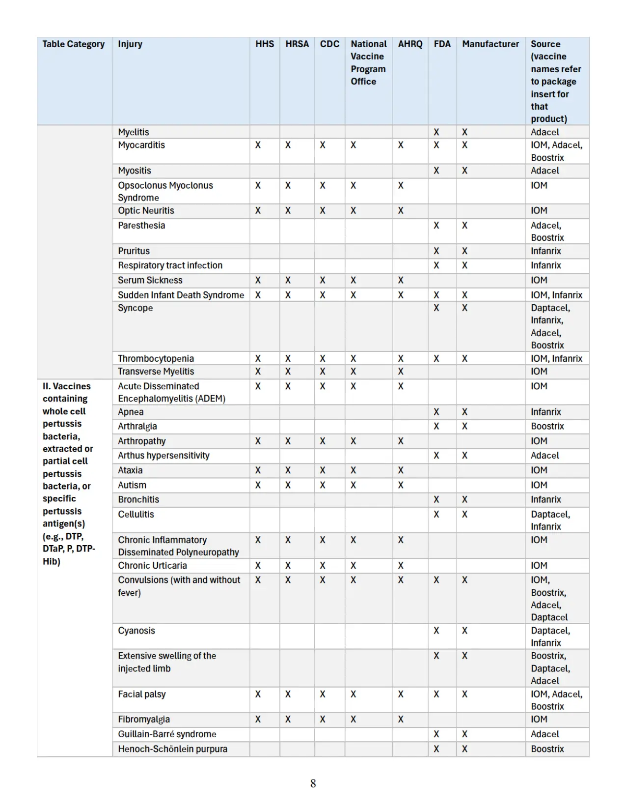 Se adjunta como “Apéndice” un cuadro que identifica parejas específicas de vacuna y lesión que las autoridades sanitarias federales han reconocido previamente en diversas publicaciones oficiales como asociadas con vacunas cubiertas conforme al significado de 42 U.S.C. § 300aa-14(e). Este cuadro recopila hallazgos y reconocimientos contenidos en el informe del IOM de 2012, encargado y/o financiado por HHS, HRSA, CDC y la Oficina Nacional del Programa de Vacunas; en el informe AHRQ de 2021; en materiales del CDC; y en los prospectos aprobados por la FDA de los fabricantes de vacunas.