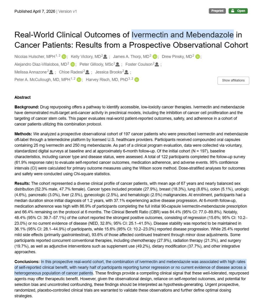 Real-World Clinical Outcomes of Ivermectin and Mebendazole in Cancer Patients: Results from a Prospective Observational Cohort.” DOI 10.5281/zenodo.19455635https://zenodo.org/records/19455636CienciaySaludNatural.com