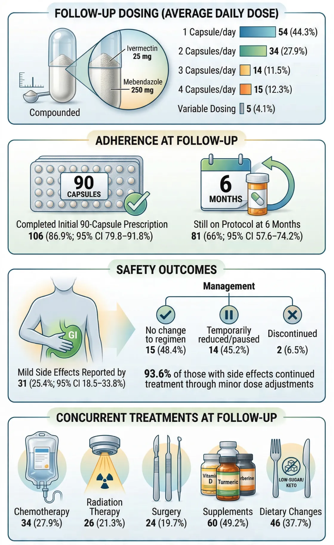 Se analizó una cohorte observacional prospectiva de 197 pacientes oncológicos, de los cuales 122 completaron seguimiento estructurado alrededor de los seis meses (tasa de respuesta del 61.9%). Los pacientes recibieron una prescripción compuesta de ivermectina y mebendazol por profesionales con licencia en Estados Unidos, y los resultados fueron recabados mediante encuestas digitales estandarizadas sobre estado oncológico, adherencia y seguridad.