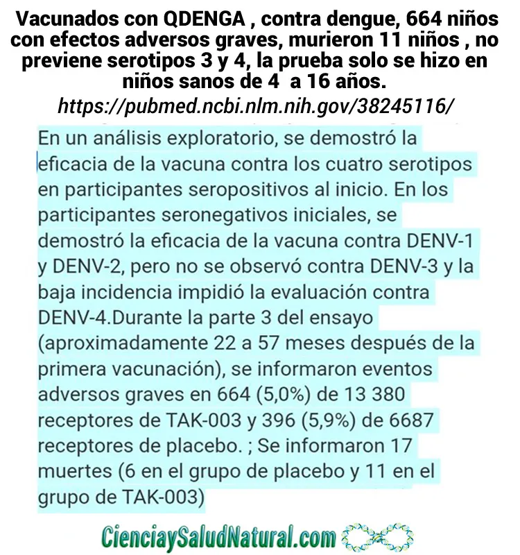 En los ensayos clínicos, entre los vacunados con la vacuna QDENGA, 664 niños sufrieron efectos adversos graves y 11 murieron. Esta vacuna no previene serotipos 3 y 4 y los ensayos solo se hicieron en niños sanos de 4 a 16 años.