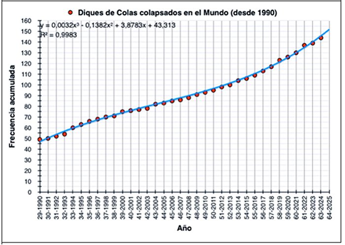 La Figura 1 resume la información del sitio web “Cronología de las principales fallas de los diques de colas megamineros”. La modelización matemática mediante el uso de una función polinómica de tercer grado (línea que conecta los puntos) permite predecir para 2025 la ruptura de al menos ocho diques de colas de desechos megamineros en el mundo.-