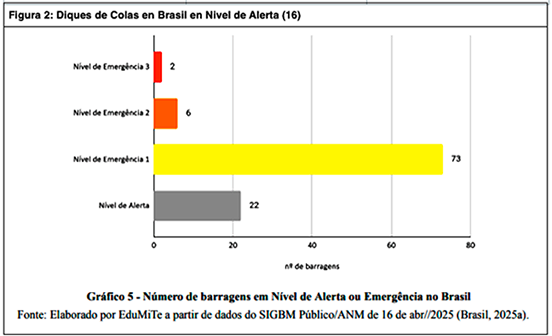 En mayo de 2025 se consigna que de las 911 represas que constan en el Sistema de Gestión de Seguridad de Represas de Minería Pública (SIGBM) de la Agencia Nacional de Minería (ANM), 103 están en nivel de Alerta (NA) o nivel de emergencia (NE) activadas (22 están en NA y 81 en NE, con aumento considerable sobre los datos disponibles aún en enero de este año) 16. La situación de nivel de emergencia se activa cuando hay riesgos inmediatos para la seguridad. Nivel de emergencia es la Convención utilizada por la Agencia Nacional de Minería (Agência Nacional de Mineração, ANM) para graduar las posibles situaciones de emergencia que puedan comprometer la seguridad de la presa. Se trata de tres niveles de emergencia, siendo el Nivel 3 (NE3) el más grave, cuando «la ruptura es inevitable o está ocurriendo». El nivel 2 (NE2) se activa cuando el resultado de las acciones adoptadas en la anomalía identificada se clasifica como «no controlado» por la legislación. El nivel 1 (NE1) es activado cuando son identificadas anomalías o cualquier otra situación con potencial comprometimiento de seguridad de la estructura que fueron clasificadas como controladas, siempre que una serie de acciones con el fin de controlar esos riesgos sean realizadas por la minera. Como ejemplo: El volumen total de las presas en Nivel de Emergencia accionadas en Minas Gerais es de 463 millones de metros cúbicos de lodos tóxicos; con 24,5 millones de metros cúbicos corresponden al total de presas en Nivel de Emergencia 3, que es el riesgo más elevado 16.